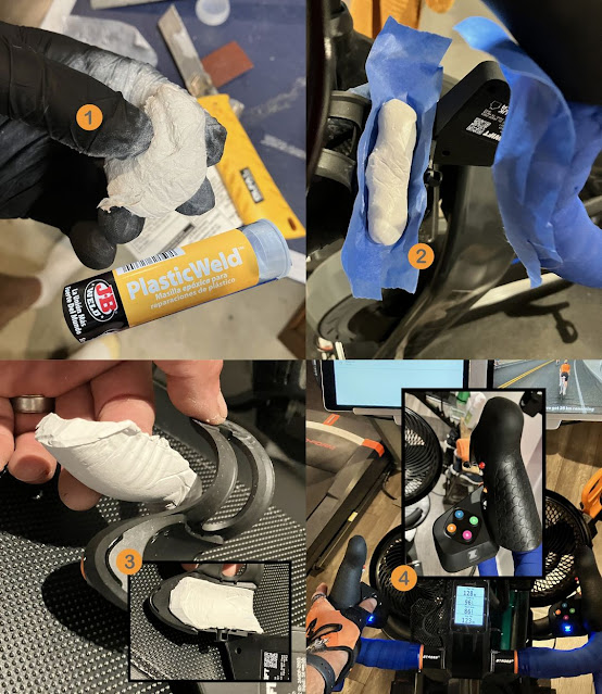 Masking tape is used to keep the putty from sticking. Place some putty under the controller. Press and lock into position under the brake hoods. Wait about 2 hours.